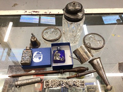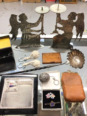 Lot 1004Sterling silver pomander with floral embossed decoration, Royal Navy silver and enamel sweet heart brooch, enamelled Coronation pin, plated toddy ladle, pair of angel candlestick holders and oth...