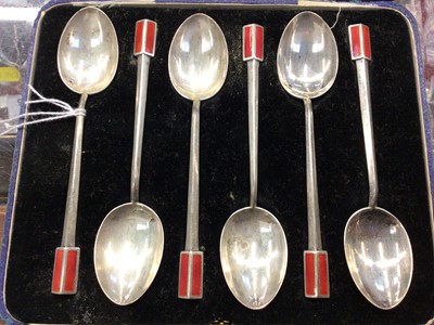 Lot 1045Set of six George V silver and enamel teaspoons in a fitted case, (Birmingham 1933).