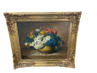 Lot 880Old oil on canvas still life study of flowers, in gilt frame with inscription verso