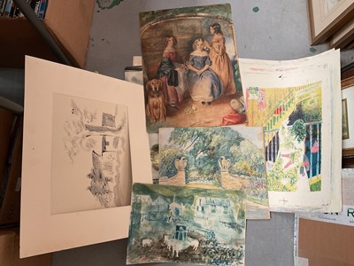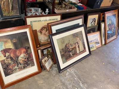 Lot 932Group of assorted pictures to include Sir William Nicholson print of Lord Roberts, various signed etchings, an antique map, a watercolour of a chimpanzee and other pictures (1 box).