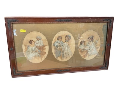 Lot 914Georgian silk work triple portrait with painted features, framed