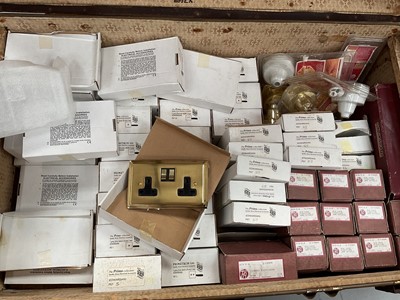 Lot 868Antique trunk filled with new old stock house fittings, including brass door plates, door knobs, dimmers, sockets, etc, total purchase value almost £3000 in 1998