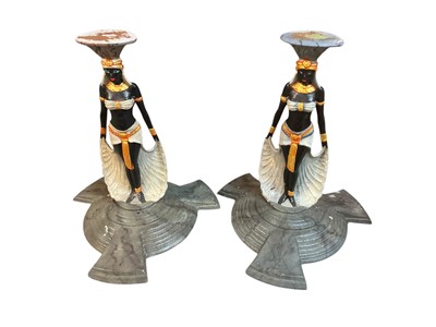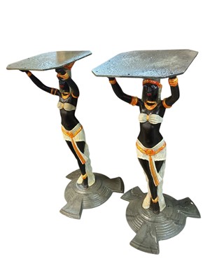 Lot 918Pair of Art Deco style cast iron table pedestals, with Egyptian figural supports on stepped spread base, 71cm high
