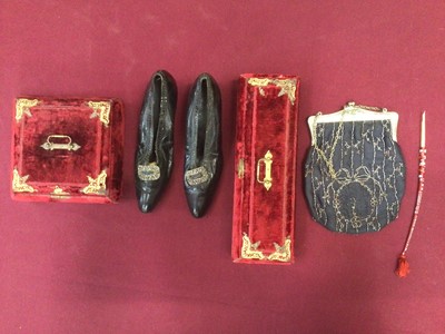 Lot 2066Vintage items including Edwardian black shoes, Art Deco steel bead evening bag, two antique red velvet jewellery