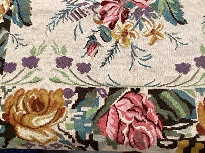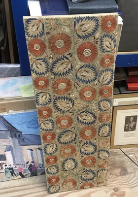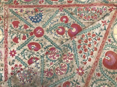 Lot 208119th century Suzani textile worked in panels and re-stitched together. Hand stitched silk thread embroidery over drawn pattern on linen foundation cloth. Traditional floral design.