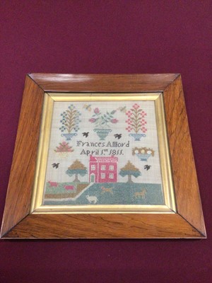 Lot 2082KG111 Needlework Sampler Garden Scene Frances Allord April 1st 1811. Plus a large perforated paper sampler Anne Lawrence 1902