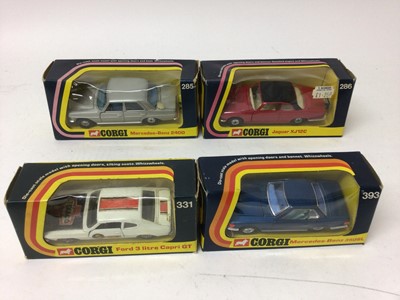 Lot 1951Corgi Mercedes-Benz 350SL No. 393, Jaguar XJ 12C No. 286, Mercedes-Benz 240D No. 285, Ford 3 litre Capri GT No. 331, all boxed (4)