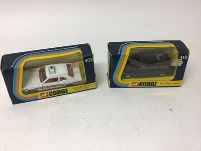 Lot 1954Corgi London Taxi No. 418, Ford Cortina Police Car No. 402, Elf Tyrell Project 34 No 161, Hesketh 308 FI No. 160, all boxed (4)