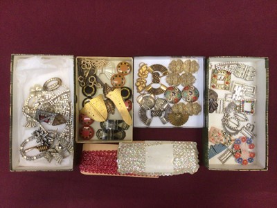 Lot 2090A box of antique and vintage dress clips including paste, glass, filigree metal work, enamel, bakelite etc. Plus a quantity of buckles and buttons.