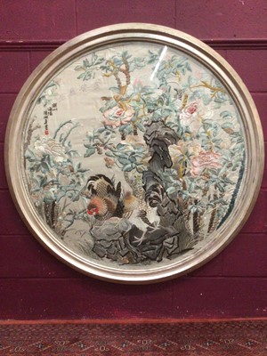 Lot 2092Large circular Chinese embroidered silk panel depicting cockrel and chicken in rocky landscape with trees and flowers. Embroidered signature. Framed and glazed. Diameter 120cm approximately.