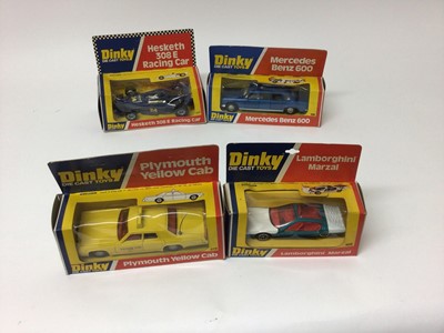 Lot 1974Dinky Lamborghini 189 Hesketh 308 Racing Car 222, Plymouth Yellow Cab 278, Mercedes Benz 128, Bell Police Helicopter 732 plus others (Qty)