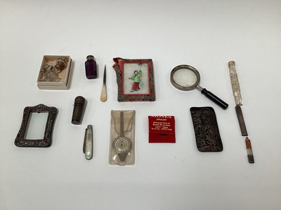 Lot 240719th century Chinese silver cotton spool in case, 19th Chinese paintings on rice paper in original box, 1947 Chelsea Football programme with ticket, three Victorian glass scent bottles and sundries