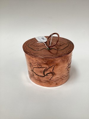 Lot 2402Newlyn copper tea caddy, the pull-off cover with loop handle, the body relief decorated with galleons, stamped mark to base, 13.5cm high