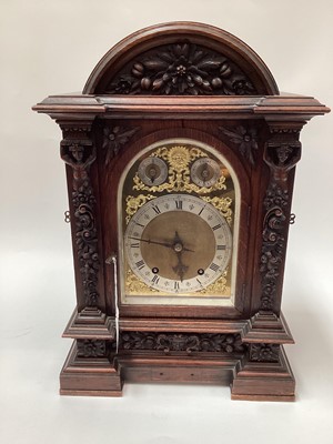 Lot 2414A late Victorian carved oak case chiming mantel clock, the arched brass dial with slow/fast and chime/silent subsidiary dials, brass W & H movement, 50cm high