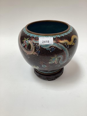 Lot 2418Chinese cloisonné jardinère, decorated with dragons chasing a flaming pearl, with a carved wooden stand, 16cm high without stand