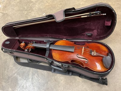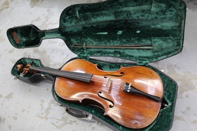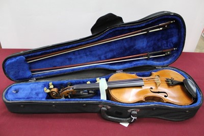 Lot 221919th century German copy of a Jacobus Stainer violin, with 14 inch back, two bows, cased, label dated 1888