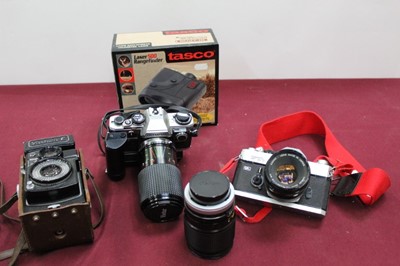 Lot 2358Group of cameras, lenses, accessories and binoculars, including a Nikon EM, Pentax SP 1000, box cameras, digital cameras, etc (3 boxes)