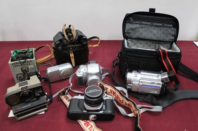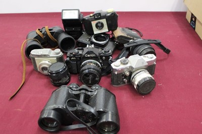 Lot 2350Quantity of cameras, including a Yashica-E, Olympus OM10 with telephoto lens, Canon FTB with lenses and flash, and assorted binoculars