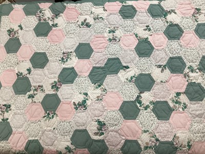 Lot 2095Patchwork Hand and machine made green and floral hexagon quilt with makers name and date 1988, similar pink quilt 1996. Plus three patchwork quilted decorative panels.
