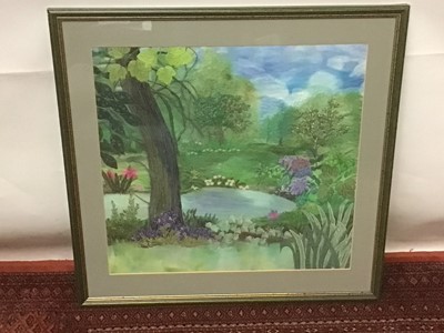 Lot 2096Fabric art picture, water colour, applique and embroidery garden scene.