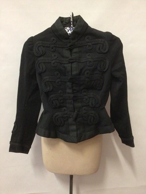 Lot 2097Victorian jacket with nipped waist, flared peplum, trim with black braid. A Victorian black under-bust corset with steel boning and black ribbon lacing plus a Victorian cropped black blouse with l...