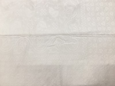 Lot 2099Victorian white damask tablecloth arts and crafts design woven pattern, patent no. 2196 AD 1884 woven in the savage edge. Plus some lace trimmed cloths and vintage fabrics.