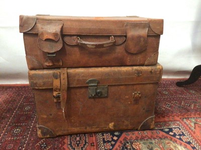 Lot 2100Vintage luggage a leather trunk, leather lined and with removable tray plus a suitcase, floral lining with pockets.