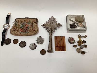 Lot 2438Collection of military badges, map measure, enamel box, cross, buttons and sundries.
