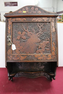 Lot 2432Black Forest type caved hanging cabinet, with figures, foliage and a stag, 61cm high x 44cm across