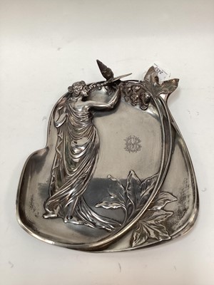 Lot 2455WMF Art Nouveau style dish, relief decorated with a woman holding a bird, marks to base, 32cm high