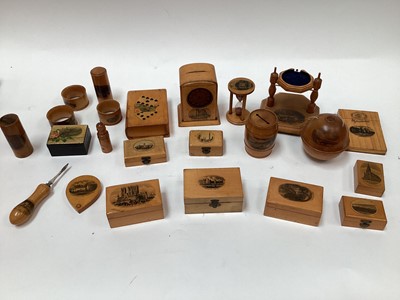 Lot 2456Group of Mauchline ware, including boxes, pocket watch holder, egg timer, money boxes, etc