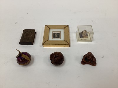 Lot 2461Sundry items, including two boxwood netsuke, a framed penny black stamp, a Limoges enamel cherry box, a Queen Victoria vulcanite vesta case, and a specimen of Blue John