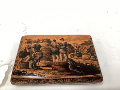Lot 2470Rare Victorian Mauchline ware snuff box, with a penwork scene entitled 'Scotch Washing', the outside with foliate patterns, 8.5cm across