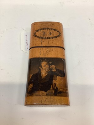Lot 2472Rare Victorian Mauchline ware cigar case, with a fine penwork scene of a gentleman drinking a glass of wine, the outside with foliate patterns, 13cm high