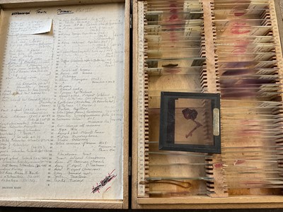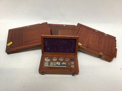 Lot 261319th century microscope case, with various lenses etc, box of microscope slides, and boxed set of weights