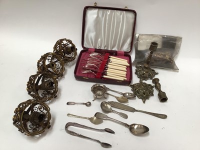 Lot 2642Collection of silver plated ware to include Tyg engraved 'U.C.S. Bicycle Race', pair of chamber sticks and cutlery sets together with a brass bell (1 box)
