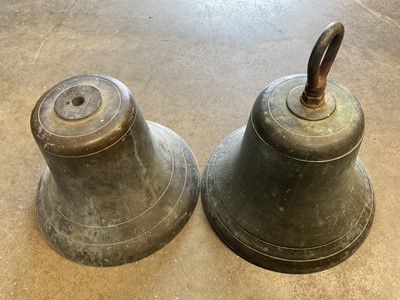 Lot 2617Near pair of antique bronze bells, one with suspension loop (total height 30cm)
