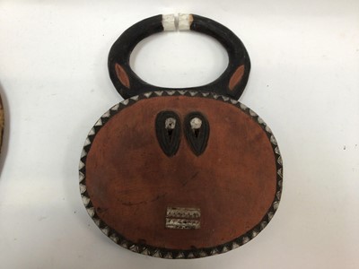 Lot 2663African Baule red-painted Goli mask, 48cm high, together with another African polychrome mask with geometric patterns, 42cm wide