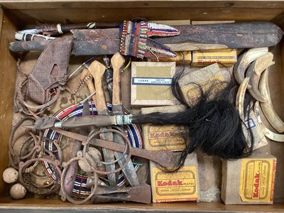 Lot 2665African items in case, including 8 boxes of slides, glass beaded necklace, beaded knife pouch with knife, 16 iron bracelets, carved figure, fly swat, and warthog tusks