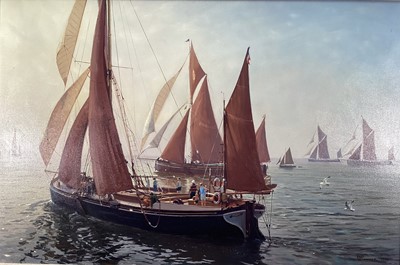 Lot 204Robin Pinnock (b.1954) oil on canvas - Thames Barges, (Thames Racers)