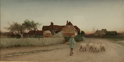 Lot 206Fred Hines, 20th Century watercolour - cottage with thatched roof, figures, and sheep, signed and dated