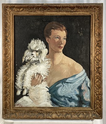 Lot 258Oil on canvas of a woman holding a poodle, signed and dated 51, 59.5cm x 49.5cm, in gilt frame