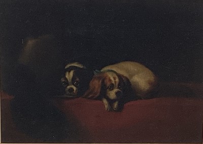 Lot 213English School, 19th century oil on canvas - Two spaniels, 26cm x 36cm, framed within mount, glazed frame