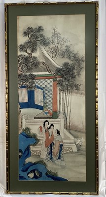 Lot 198Pair Chinese watercolours in glazed frames Figures by a Palace and Tea beneath Trees, approx 89cm x 36cm (2)