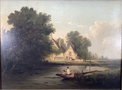 Lot 20019th century oil on canvas - Village pond with figures in boat, 44cm x 59cm, in gilt frame