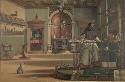 Lot 19419th century engraving - the Vision of Saint Augustine of Hippo in his study, after Vettore Carpaccio in the Scuolo di San Giorgio degli Schiavone, Venice, 44cm x 68cm, framed