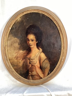 Lot 237English School 19th century, oil on canvas laid on board, portrait of Mrs J. Princep standing in a landscape, oval in gilt frame, inscribed verso. 27 x 21cm.