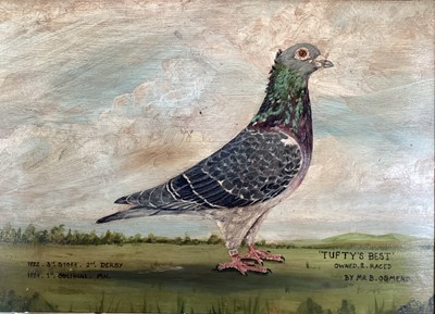 Lot 239English School 20th century, "Tufty's Best" a racing pigeon owned by Mr. B. Osmend, inscribed in gilt frame. 24 x 34cm.