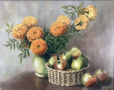 Lot 241Margaret Cusack, oil on canvas, still life of fruit and flowers, signed also label verso, in gilt frame. 40 x 50cm.