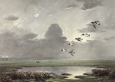 Lot 242David Scott, gouache, flight of oyster catchers over Burton Marshes, signed, in painted frame, 34 x 46cm.